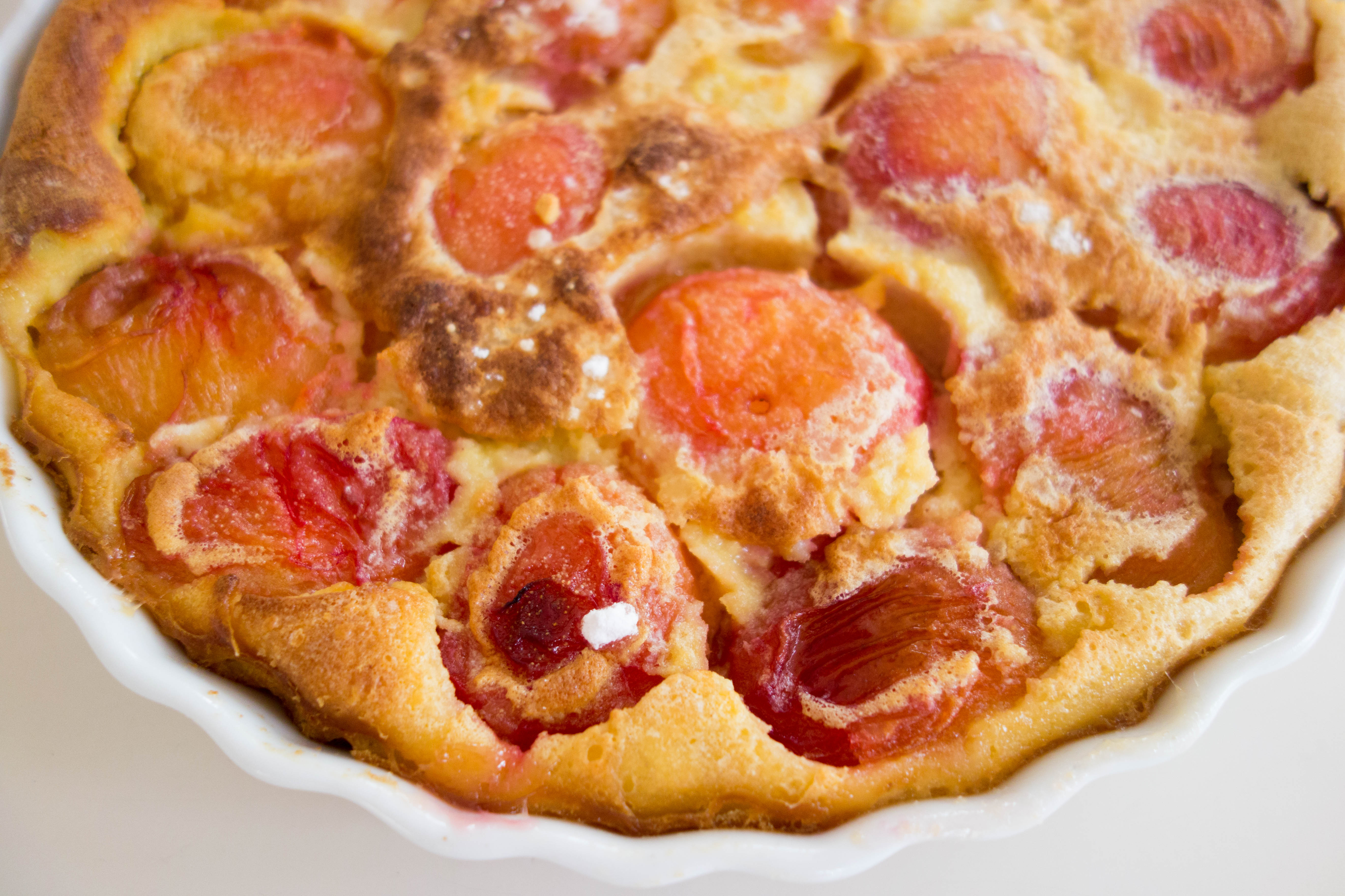 På ein varm og god tidleg haustdag gjeld det å finna balansen mellom utetid i sola og kjøkkentid. Enklare enn denne desserten kan det knapt gjerast. Inspirasjonen er den franske clafoutis, der ei røre av egg, sukker, mjøl og mjølk vert hellt over kirsebær før baking i ovn. Eg har bytt kveitemjølet ut med mandelmjøl, mandelsmaken er perfekt til mange slag frukt og bær, også plommer. Og i botn sjølvsagt plommer, i dag Victoria fordi det nett no bognar av dei. Det går kjapt å dele plommene, ta ut steinen og legge dei med skjereflata ned i den smurte forma. Sjå fullstendig oppskrift her