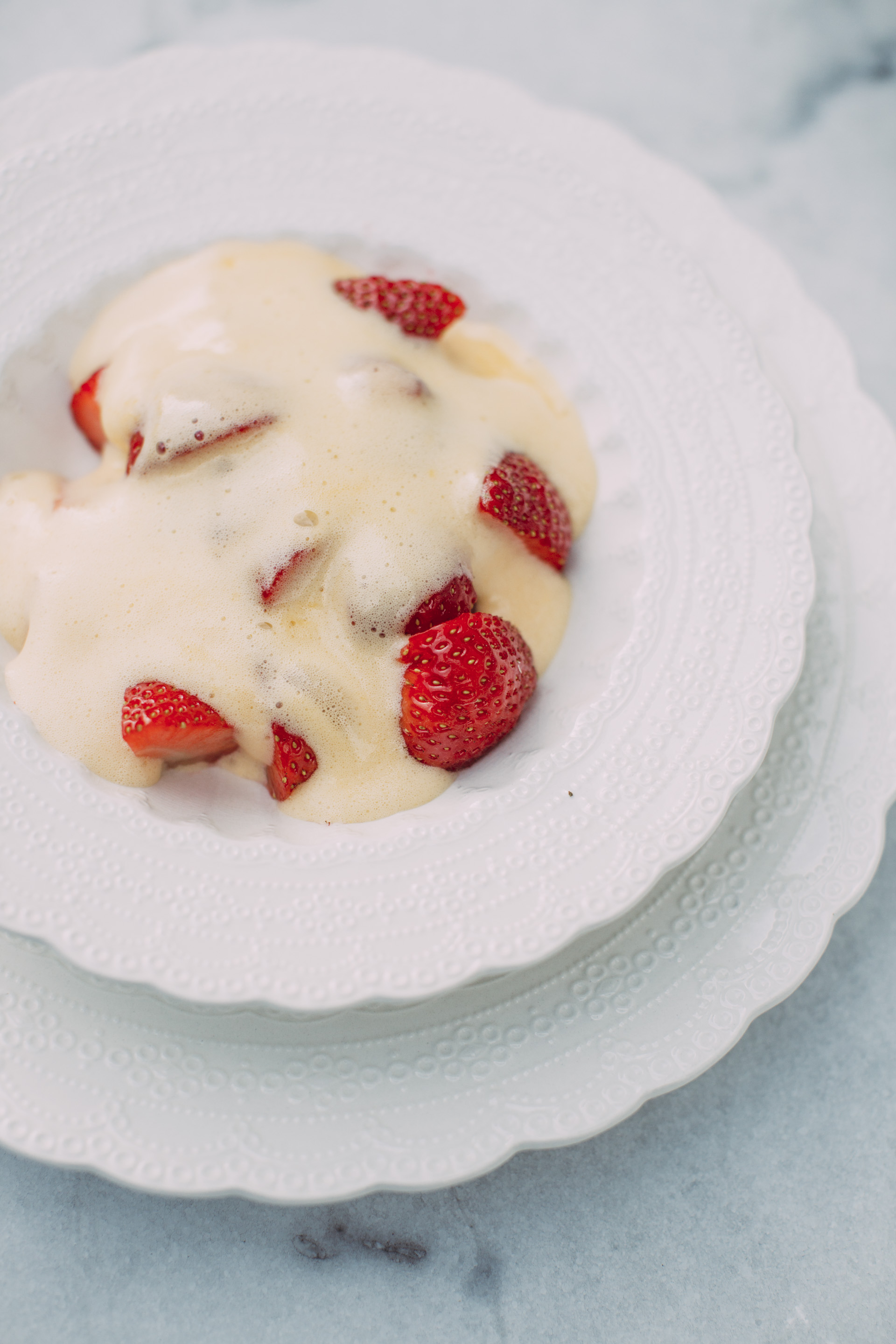 Den nyaste desserten eg laga med hyll er ein sabayonne med hylleblomsaft, den var perfekt over nyplukka jordbær frå nabolaget.