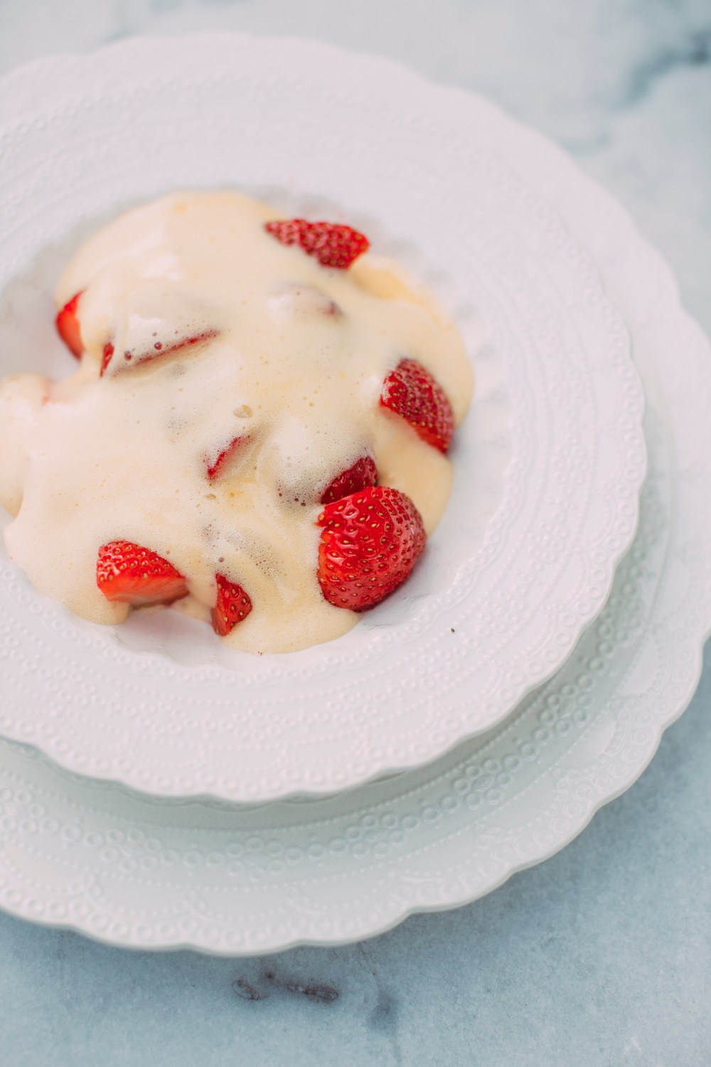 - Ha alt i ei skål som toler varme. Sett skåla over ei gryte med varmt vatn, vatnet skal ikkje nå opp til skåla. Varm opp, og pisk heile tida. Pisk til blandinga er luftig og har kremkonsistens. Ta skåla bort frå varmen og fortset å piske til blandinga er litt avkjølt og held forma. Aus over dei nyplukka jordbæra og server.