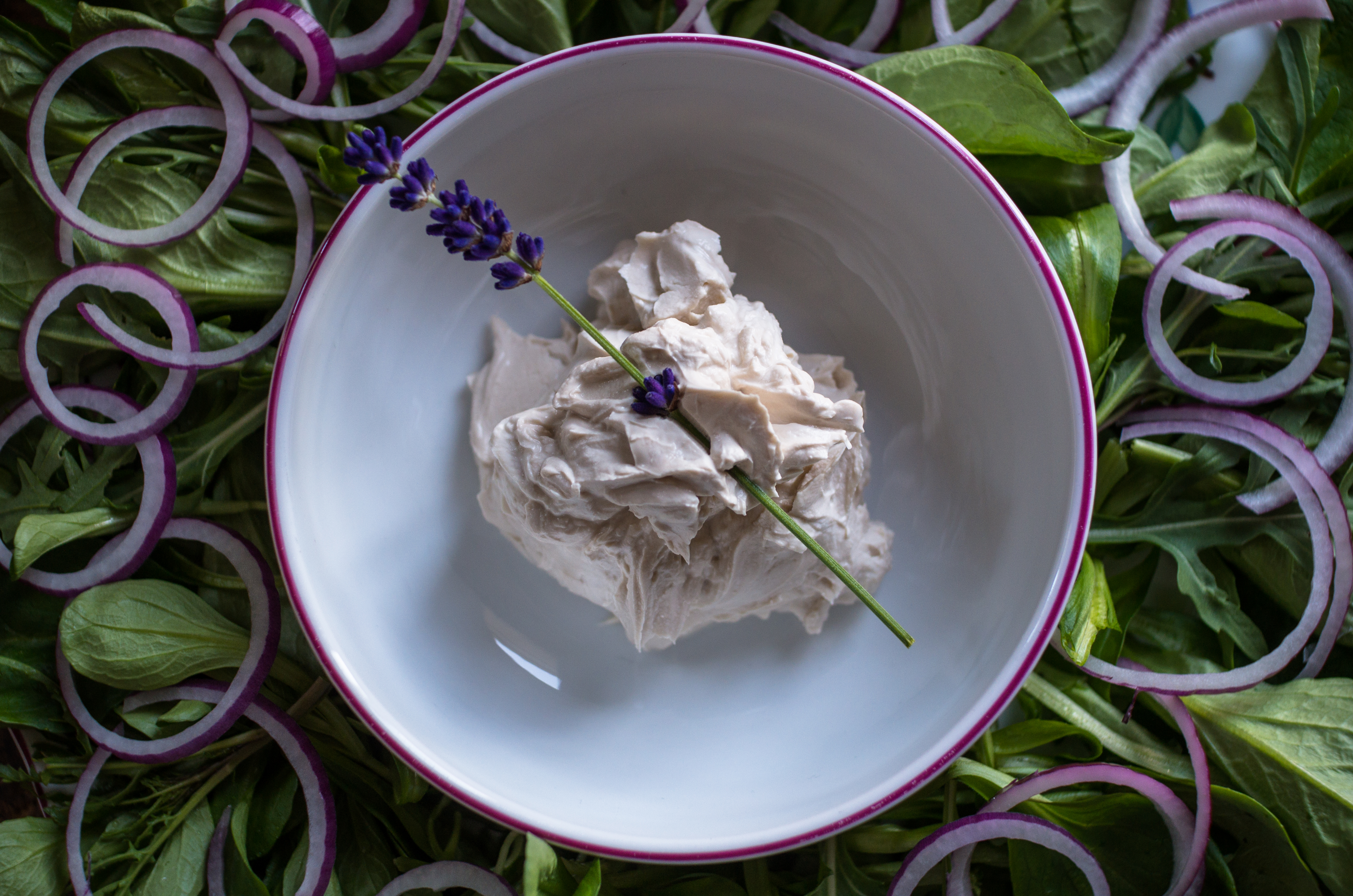 Eit lite utval av kalde eller lune smårettar som passar saman utgjer eit fint, enkelt måtid. Her har eg brukt grønt frå hagen; vårsalaten sådde eg i slutten av mai, den står kraftig og fin no. Ruccolaen kjem på rota frå i fjor utan at eg treng å foreta meg noko. Med litt farge frå ringar med raudløk, litt olivenolje og fingersalt, og ein pakke snøfrisk rørt opp med balsamico, har eg ein smakfull sommarsalat.
