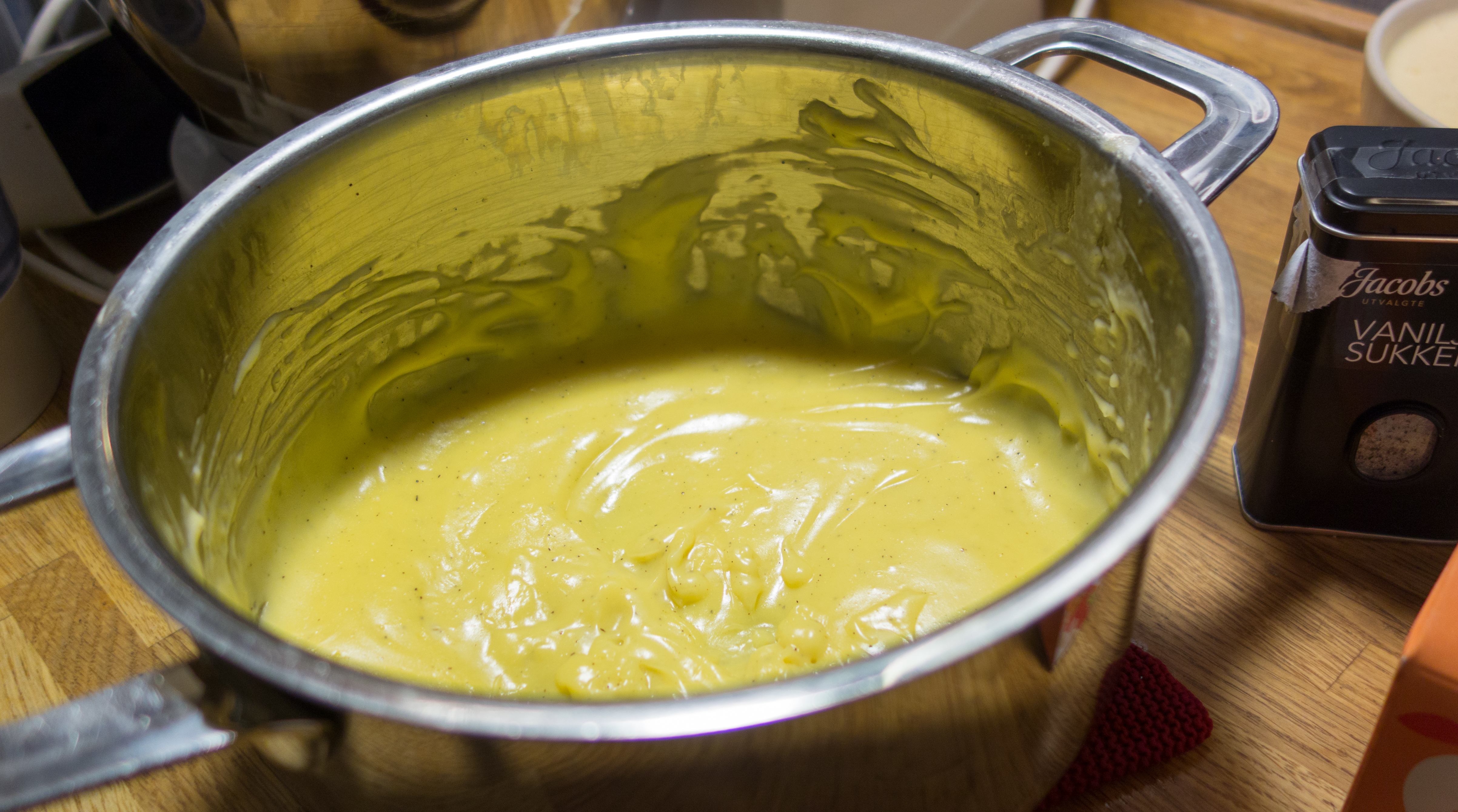 - Bland eggeplommene med maizena i ein bolle. Splitt og skrap ut frøa på vaniljestanga og ha både frø og stang i fløyten. Kok opp fløyten/fløytemjølka med sukkeret og vaniljen. Hell kokande fløyte over eggeplomme/maizenablandinga, mens du vispar godt. Hell blandinga tilbake i kjelen gjennom ein sil. Varm opp på svak varme under visping, la kremen tjukne medan du vispar heile tida.